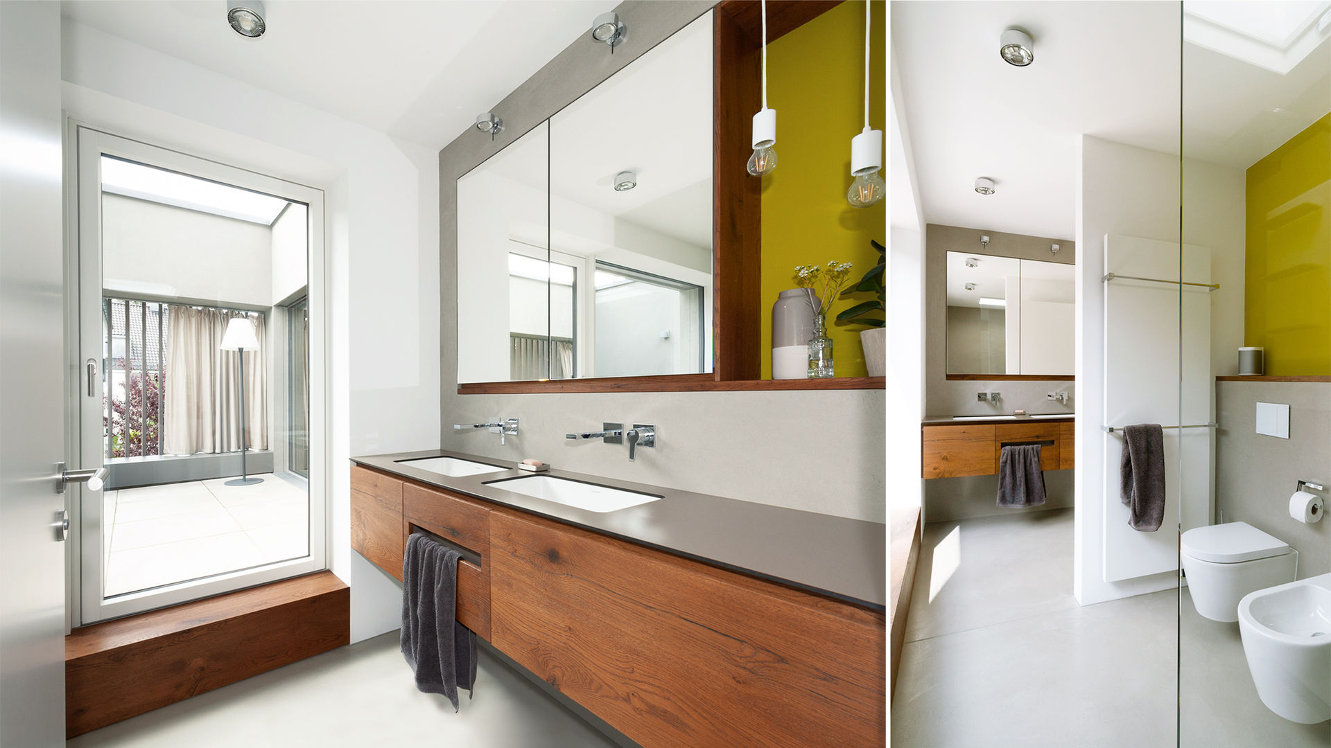 Der zementgebundene Spachtelboden steht im bewussten Kontrast zu der geölten Altholz-Eiche und den mattlackierten Oberflächen der Stauräume.
